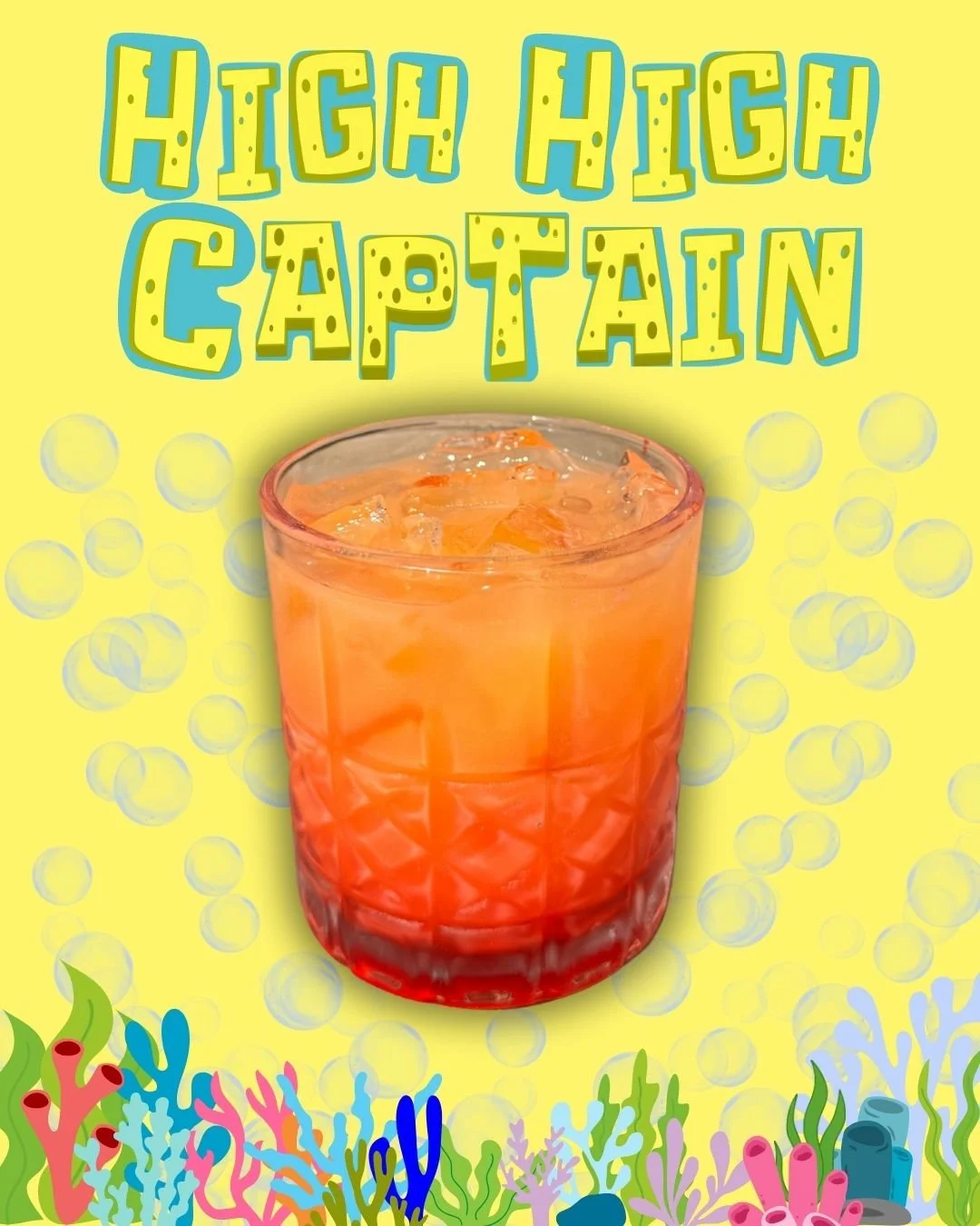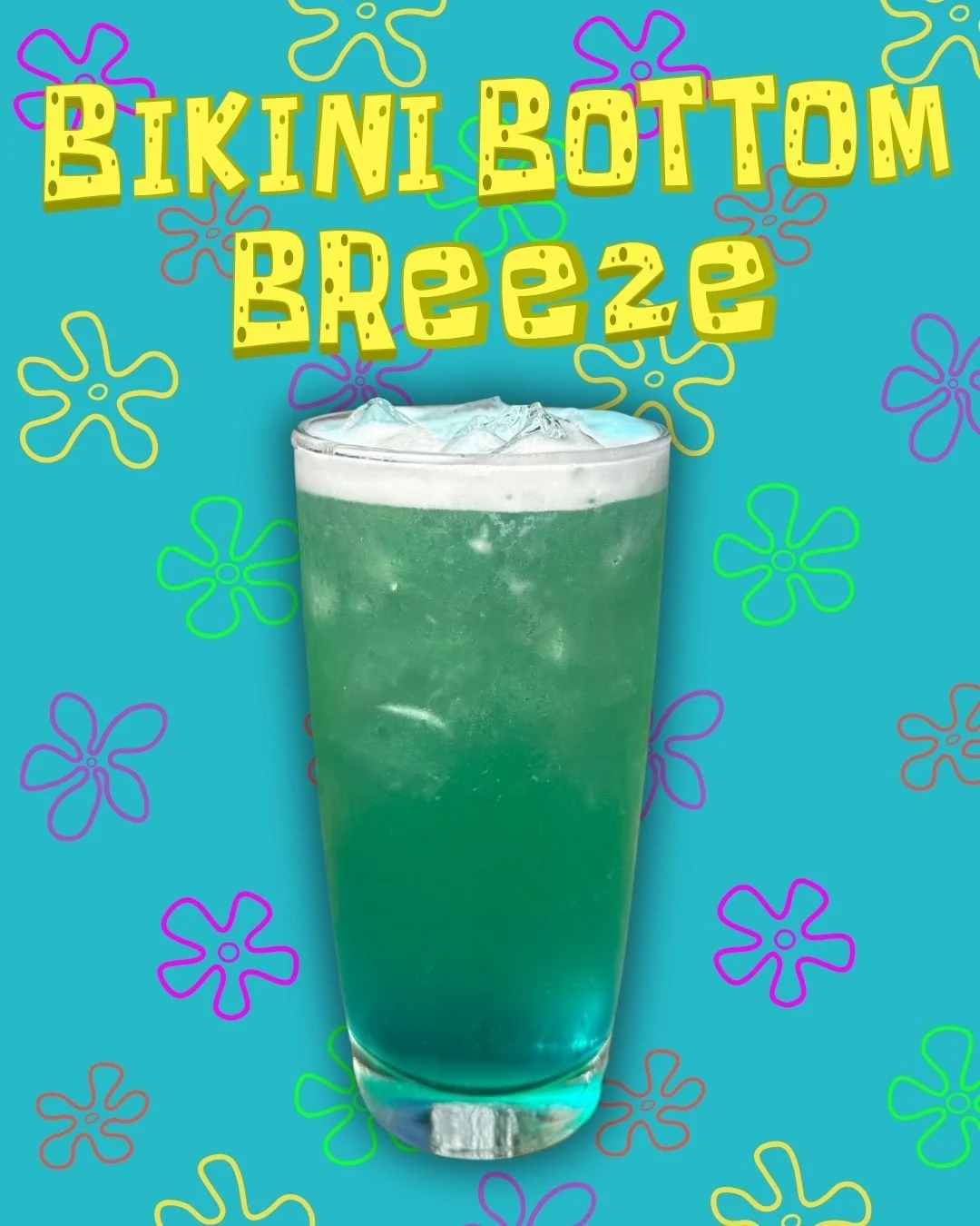 A bright, ocean-blue blend of coconut rum, blue curaçao, pineapple, and lime—tropical, breezy, and straight from Bikini Bottom.