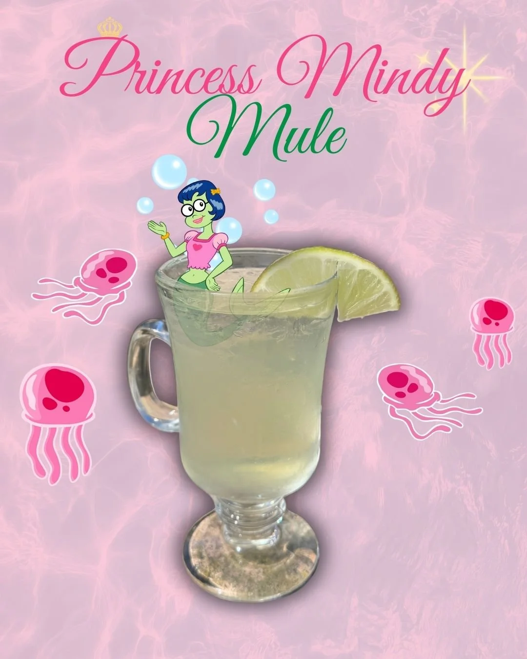 A bubbly, under-the-sea mule featuring cucumber mint vodka, lime, ginger beer, and club soda—made for mermaids, royalty, and Bikini Bottom locals alike.